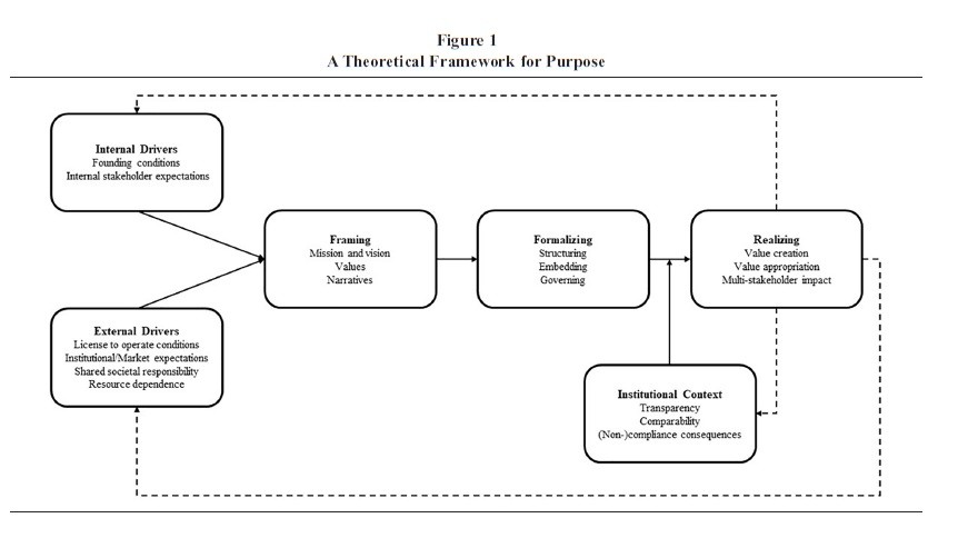 Purpose is a concept often used in managerial communities to signal and define a firm’s benevolent and pluralistic approach to its stakeholders beyond its focus on shareholders. While some evidence has linked purpose to positive organizational outcomes such as growth, employee satisfaction, innovation, and superior stock market performance, the definition and application of purpose in management research has been varied and frequently ambiguous. We review literature streams that invoke purpose in the for-profit firm and propose a unifying definition. Next, we develop a framework to study purpose that decouples its framing and formalization within firms from its realization, thus helping to avoid conflation of the presence of purpose with positive organizational outcomes. The framework also highlights internal and external drivers that shape the framing of purpose as well as the influence of the institutional context on its adoption and effectiveness. Finally, we provide a rich agenda for future research on purpose.